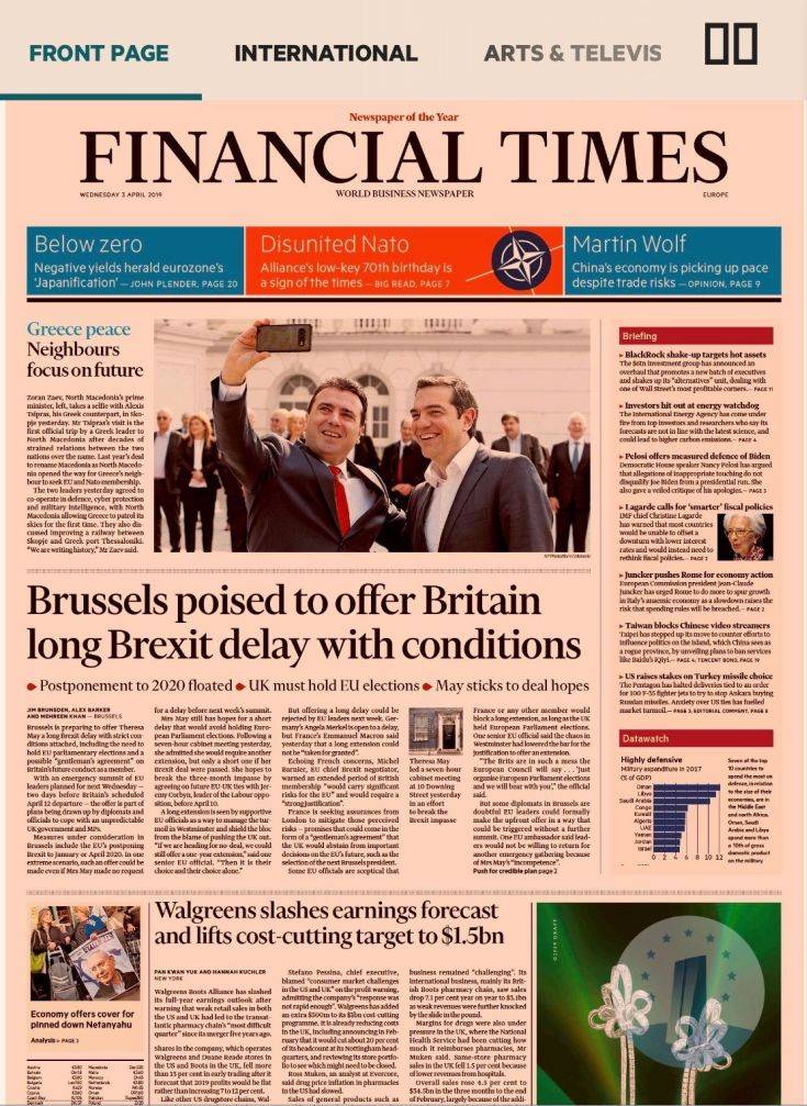 Οι δύο ηγέτες χθες συμφώνησαν να συνεργαστούν στην άμυνα, στην κυβερνοασφάλεια και τη στρατιωτική κατασκοπεία, με τη Βόρεια Μακεδονία να επιτρέπει στην Ελλάδα αεροπορικές περιπολίες για πρώτη φορά. Συζήτησαν επίσης τη βελτίωση της σιδηροδρομικής σύνδεσης ανάμεσα στα Σκόπια και στη Θεσσαλονίκη. «Γράφουμε ιστορία», είπε ο κ. Ζάεφ», γράφει στην πρώτη σελίδα η εφημερίδα Financial Times με φωτογραφία του πρωθυπουργού Αλέξη Τσίπρα με τον ομόλογό του της Βόρειας Μακεδονίας, Ζόραν Ζάεφ.