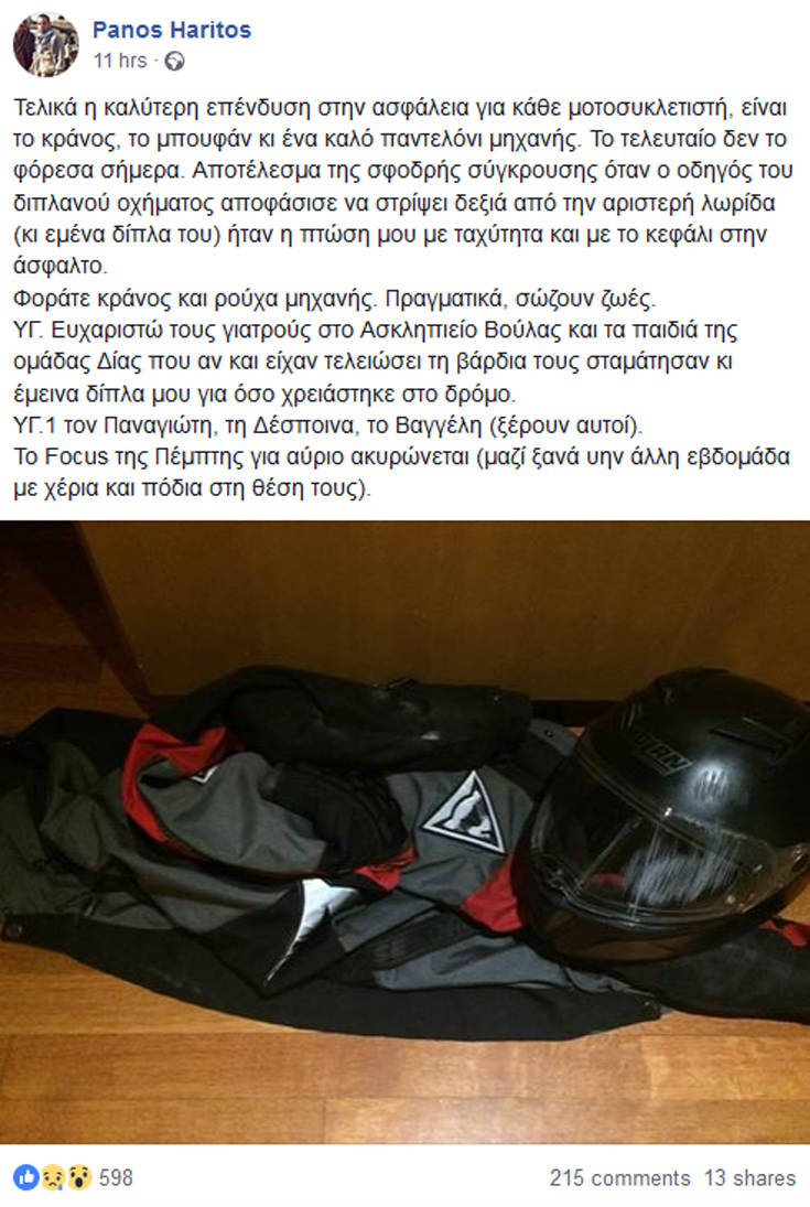 Την είδηση έκανε γνωστή ο ίδιος με ανάρτηση στο Facebook και έστειλε το δικό του μήνυμα σε όλους τους οδηγούς μηχανής.