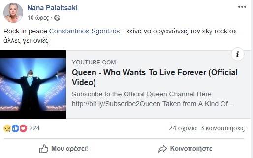 Η δημοσιογράφος δημοσίευσε στην προσωπική της σελίδα στο facebook ένα τραγούδι του συγκροτήματος Queen, γράφοντας χαρακτηριστικά: «Rock in peace Constantinos Sgontzos Ξεκίνα να οργανώνεις τον sky rock σε άλλες γειτονιές».