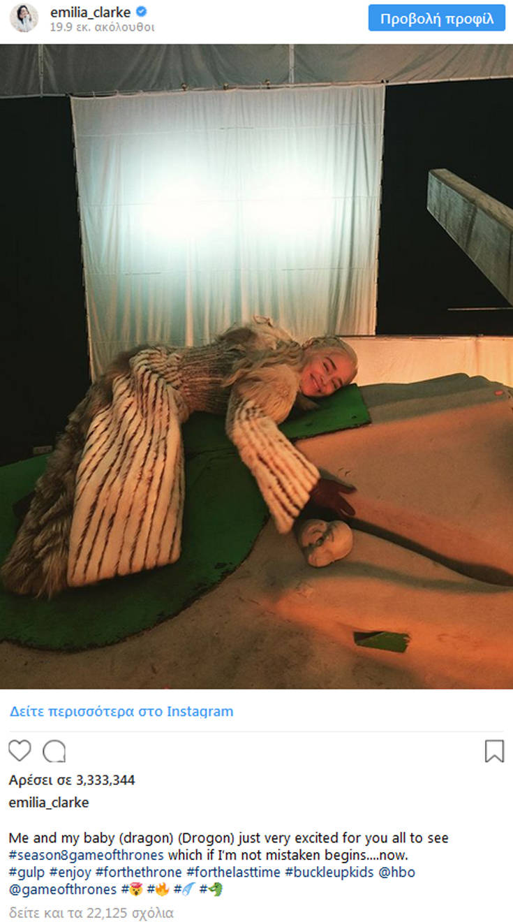 Χαρακτηριστικά η Emilia Clarke (Daenerys Targaryen) ανάρτησε μια φωτογραφία από το γύρισμα σκηνής κατά την οποία είναι πάνω σε δράκο, μπροστά από μία πράσινη οθόνη. «Εγώ και ο μικρός μου δράκος (Drogon) είμαστε πολύ ενθουσιασμένοι που θα δείτε όλοι σας τη #season8gameofthrones, που αν δεν κάνω λάθος αρχίζει τώρα».