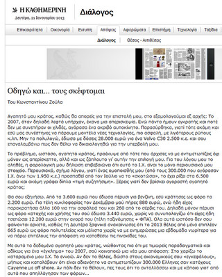 Με αυτά τα δεδομένα αγαπητό μου κράτος, νιώθοντας πια ότι με τιμωρείς παραδειγματικά και αδίκως για ένα «έγκλημα» του 2007, σού κοινοποιώ μια νέα μου απόφαση: Στο χαρίζω το καταραμένο μου Ι.Χ. Το εννοώ. Αν δεν το θέλεις, δώστο στους οικονομικούς σου «εγκεφάλους», μήπως και καταλάβουν ότι είναι αδιανόητο να αντιμετωπίζουν 300.000 Ελληνες σαν κατόχους Cayenne με off shore. Αν πάλι δεν το θέλουν, πες τους ότι το ανταλλάσσω και με κάποιο γιoτ από αυτά που απηλλάγησαν των φόρων…».