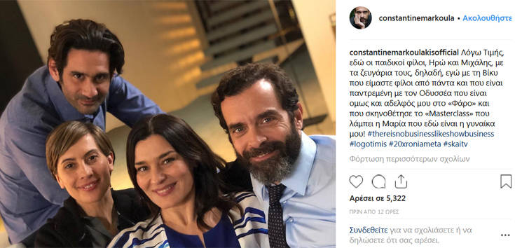 «Λόγω Τιμής, εδώ οι παιδικοί φίλοι, Ηρώ και Μιχάλης, με τα ζευγάρια τους, δηλαδή, εγώ με τη Βίκυ που είμαστε φίλοι από πάντα και που είναι παντρεμένη με τον Οδυσσέα που είναι όμως και αδελφός μου στο “Φάρο” και που σκηνοθέτησε το “Masterclass” που λάμπει η Μαρία που εδώ είναι η γυναίκα μου!» έγραψε ο Κωνσταντίνος Μαρκουλάκης στο Instagram.