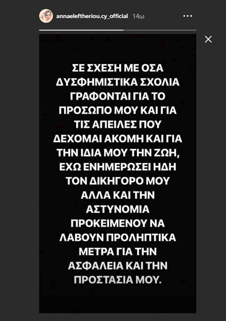 Ο λόγος για την Άννα Ελευθερίου, η οποία με μία ανάρτηση στο story της στο Instagram κατήγγειλε όσα της συμβαίνουν, ενώ αποκάλυψε πως έχει ήδη ενημερώσει την αστυνομία και το δικηγόρο της για τις απειλές που δέχεται για τη ζωή της.