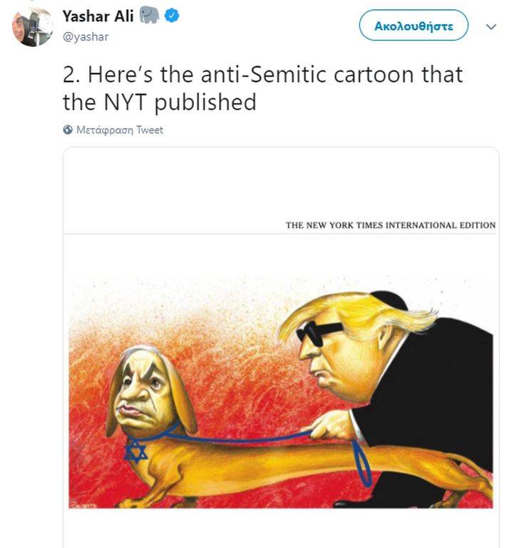 Το σκίτσο, το οποίο δημοσιεύθηκε την Πέμπτη στη διεθνή έκδοση της εφημερίδας, εικονίζει τον Νετανιάχου σαν σκύλο-οδηγό που φοράει περιλαίμιο με το άστρο του Δαυίδ και οδηγεί έναν τυφλό Τραμπ που φοράει ένα κιπά.