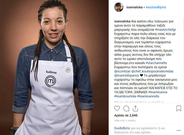 «Και κάπου εδώ τελειώνει για εμένα αυτό το παραμυθένιο ταξίδι μαγειρικής που ονομάζεται masterchef. Ευχαριστώ πάρα πολύ όλους εσάς που με στηρίξατε σε όλη την διάρκεια του διαγωνισμού, ένα τεράστιο ευχαριστώ στην παραγωγή και όλους τους ανθρώπους που είναι οι αφανείς ήρωες αλλά χωρίς αυτούς δεν θα υπήρχε όλο αυτό το ωραίο αποτέλεσμα που βλέπουμε. Στο κανάλι #starchanneltv. Ευχαριστώ που πιστέψατε σε εμένα @scontizas@chefkoutsopoulosleonidas@ioannidispanos. Το μεγαλύτερο ευχαριστώ το οφείλω στην οικογένεια μου και στους ανθρώπους που με έσπρωξαν και πίστευαν σε εμένα!! ΚΑΙ ΚΑΠΩΣ ΕΤΣΙ ΤΟ ΤΑΞΙΔΙ ΤΩΡΑ ΞΕΚΙΝΑΕΙ!» έγραψε χαρακτηριστικά.