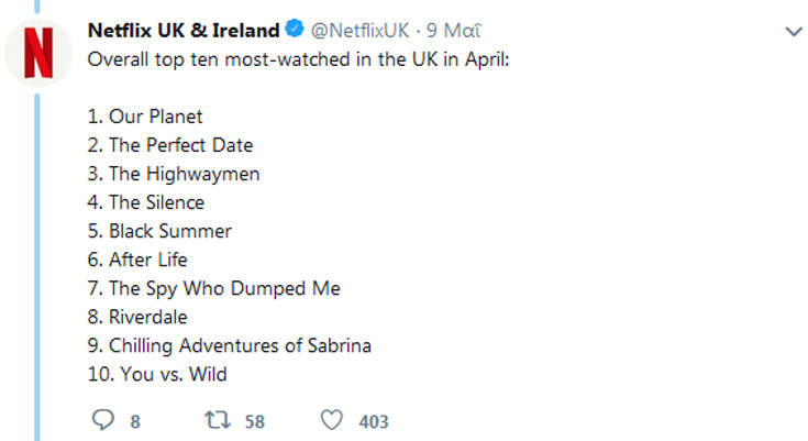Την πεντάδα με τις πιο δημοφιλείς σειρές αποτελούν οι: «Black Summer», «After Life», «Riverdale», «Chilling Adventures of Sabrina» και Star Trek: Discovery».