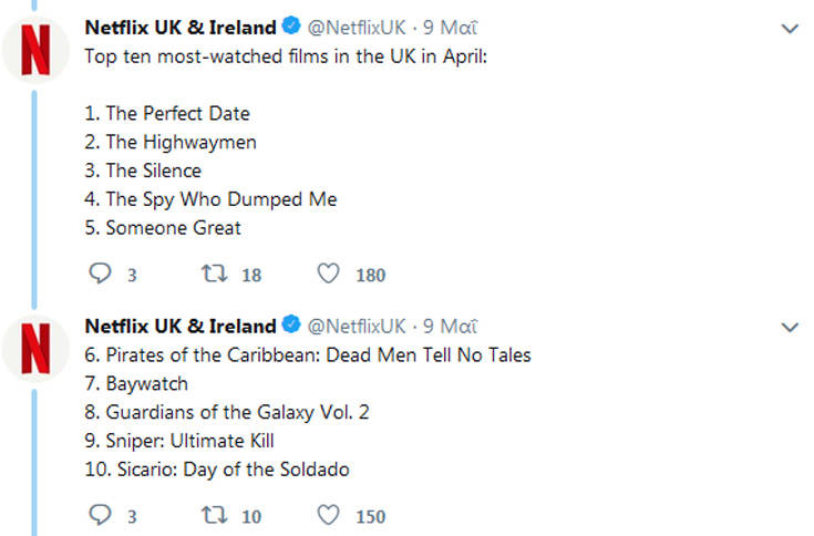 Η αρχή από το Netflix έγινε με τη δημοσιοποίηση της λίστας που αφορά το μήνα Απρίλιο, ενώ υπόσχεται πως στο μέλλον θα δημοσιεύονται κι εβδομαδιαίες προτιμήσεις. Η λίστα με το top ten που ανέβηκε στο λογαριασμό της εταιρείας στο Twitter, εκτός από τις πιο δημοφιλείς ταινίες και σειρές, περιλαμβάνει και τα πιο δημοφιλή ριάλιτι show και ντοκιμαντέρ.