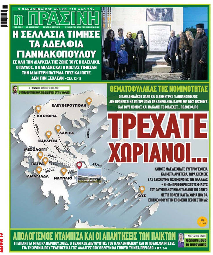 Έπειτα από τις εξελίξεις των τελευταίων ημερών στον χώρο του ελληνικού μπάσκετ, με τον διαφαινόμενο υποβιβασμό του Ολυμπιακού από την Basket League, η εφημερίδα «Πράσινη», θέλοντας να πικάρει τους «ερυθρόλευκους», κυκλοφόρησε σήμερα με ένα πρωτοσέλιδο με αρκετή ειρωνεία και δόση χιούμορ, που έχει τίτλο «Τρεχάτε χωριανοί».
