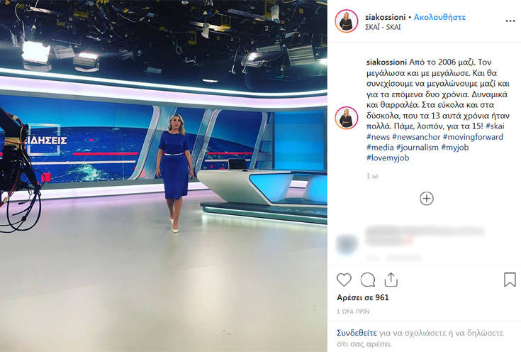 Μετά την ανανέωση της συνεργασίας τους, η Σία Κοσιώνη ανέβασε στο λογαριασμό της στο Instagram το δικό της μήνυμα για τον ΣΚΑΪ, γράφοντας: «Από το 2006 μαζί. Τον μεγάλωσα και με μεγάλωσε. Και θα συνεχίσουμε να μεγαλώνουμε μαζί και για τα επόμενα δυο χρόνια. Δυναμικά και θαρραλέα. Στα εύκολα και στα δύσκολα, που τα 13 αυτά χρόνια ήταν πολλά. Πάμε, λοιπόν, για τα 15!».