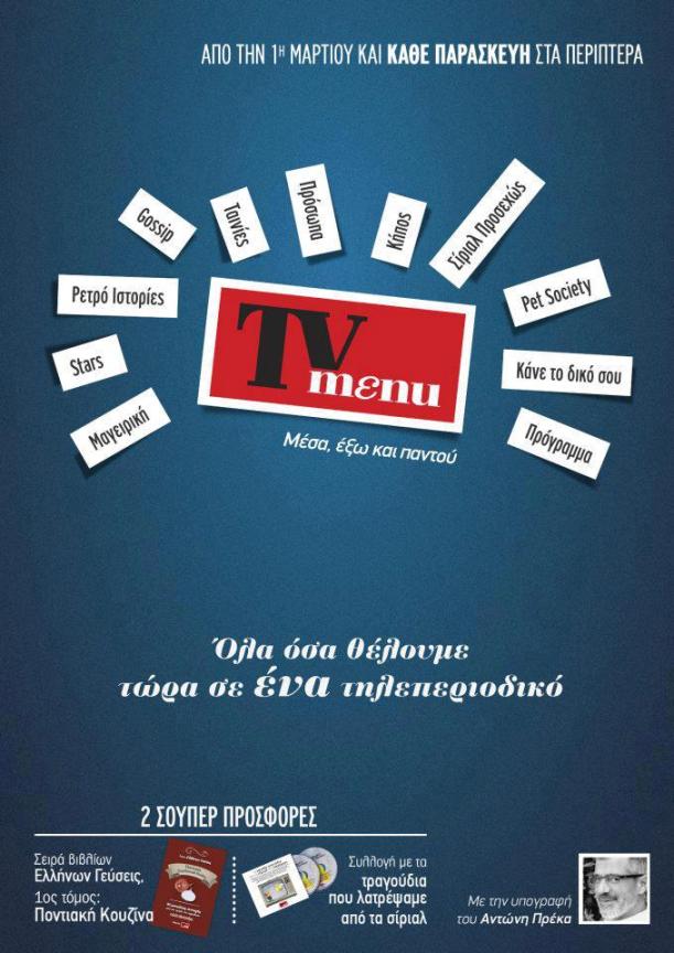 Ένα νέο τηλεοπτικό περιοδικό θα κυκλοφορήσει στα περίπτερα από την 1η Μαρτίου. Πρόκειται για το «TV menu» με εκδότη το Γιάννη Κουρτάκη και διευθυντή τον Αντώνη Πρέκα.