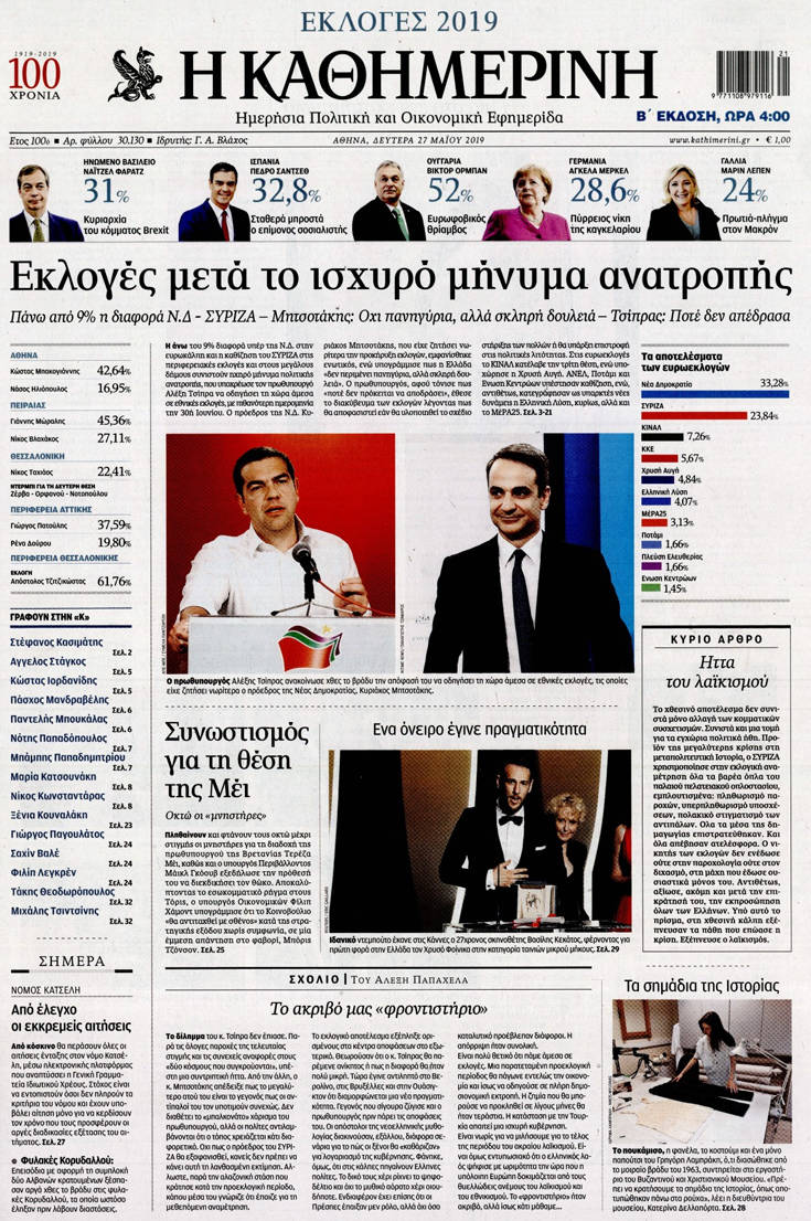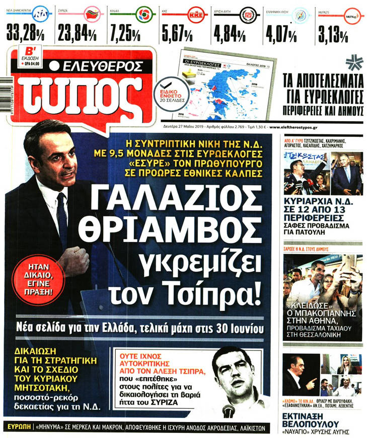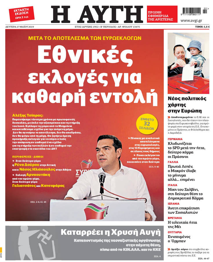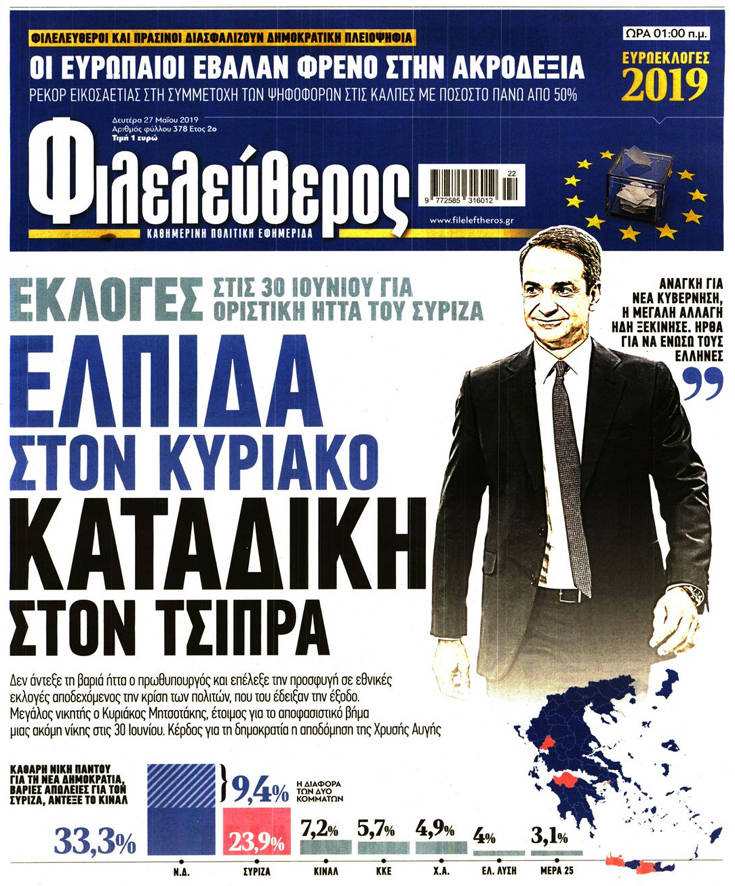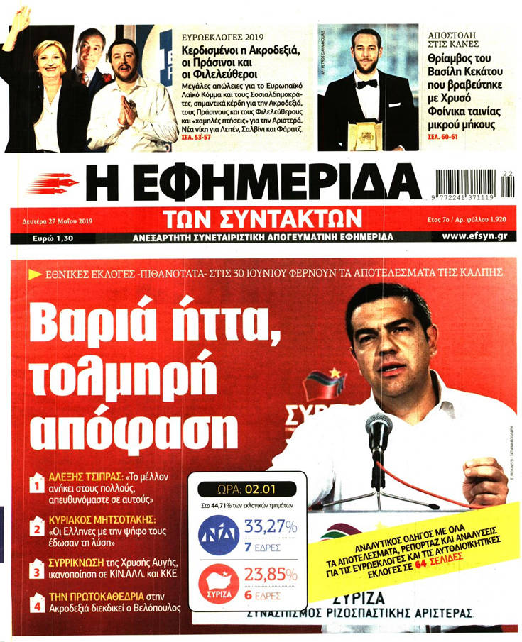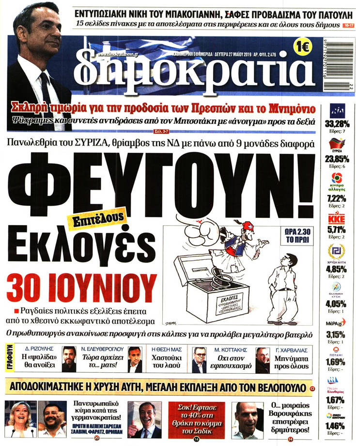 Την ήττα του ΣΥΡΙΖΑ στις ευρωεκλογές 2019 με διαφορά 9,5 μονάδων από τη Νέα Δημοκρατία και την πρόωρη προσφυγή στις κάλπες στις 30 Ιουνίου φιλοξενούν στα πρωτοσέλιδά τους σήμερα οι ελληνικές πολιτικές εφημερίδες.