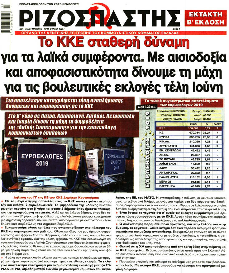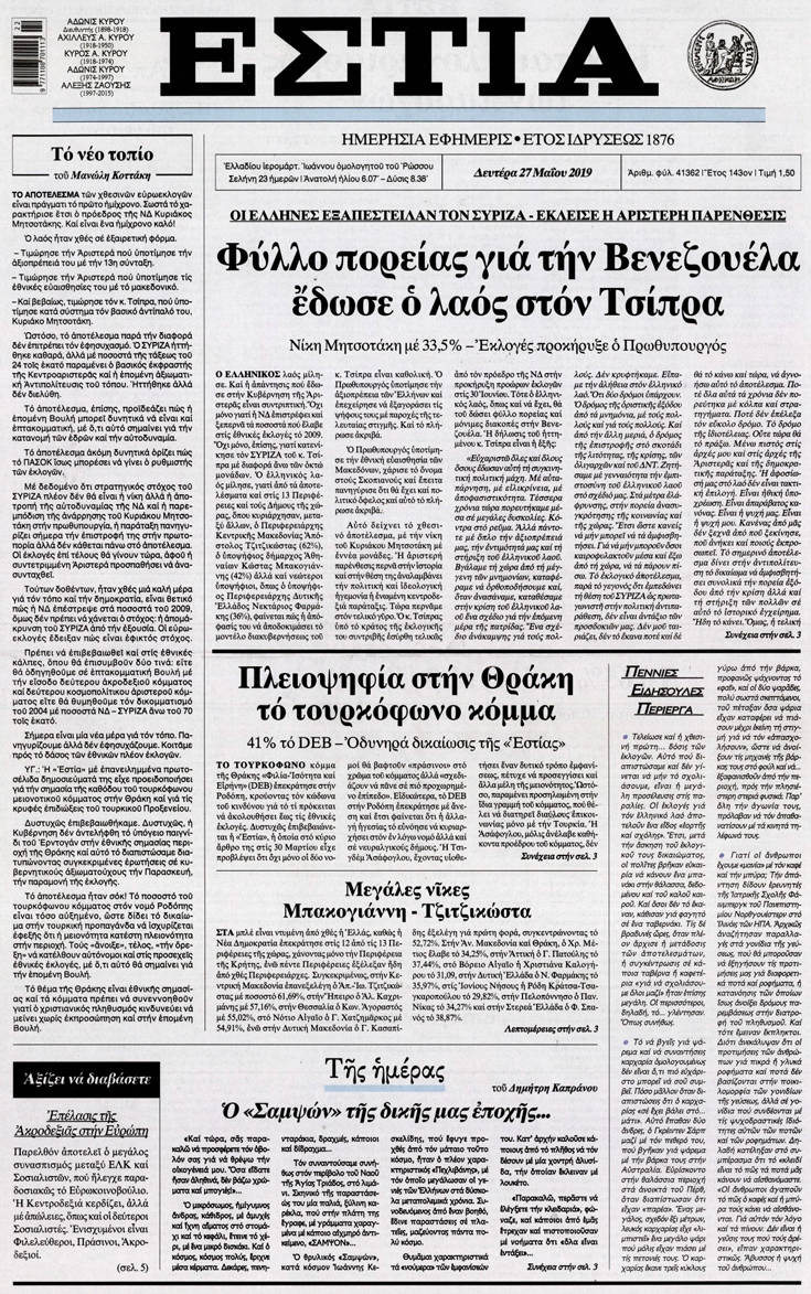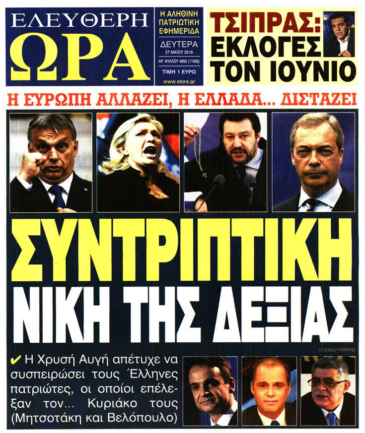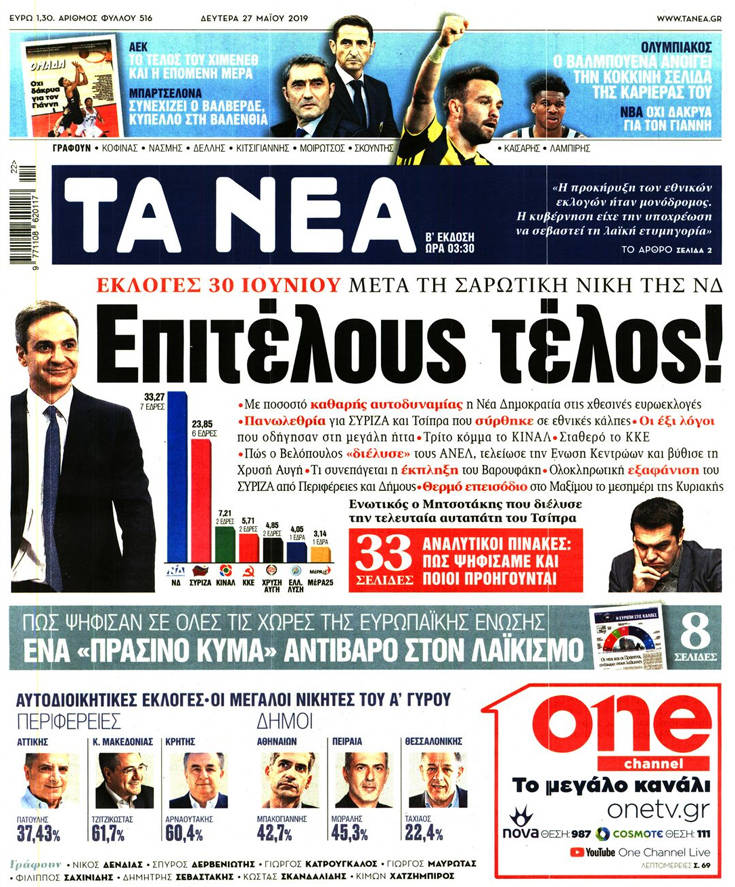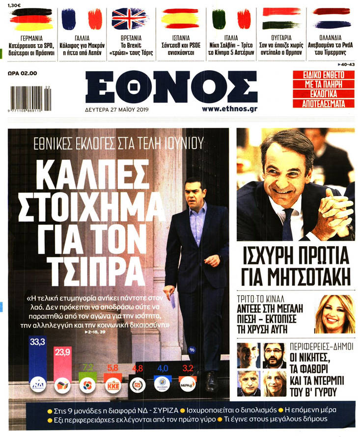 Την ήττα του ΣΥΡΙΖΑ στις ευρωεκλογές 2019 με διαφορά 9,5 μονάδων από τη Νέα Δημοκρατία και την πρόωρη προσφυγή στις κάλπες στις 30 Ιουνίου φιλοξενούν στα πρωτοσέλιδά τους σήμερα οι ελληνικές πολιτικές εφημερίδες.