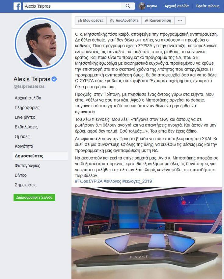 Όπως αναφέρει: «Αποφάσισα τη Τρίτη το βράδυ να πάω στη τηλεόραση του ΣΚΑΙ. Να ακουστούν & εκεί τα επιχειρήματά μας. Αν ο κ. Μητσοτάκης αποφάσισε να δοξαστεί κρυπτόμενος, εμείς θα εξαντλήσουμε όλες τις δυνατότητες για να φτάσει η αλήθεια σε όλο τον λαό. Χωρίς κανένα φόβο, σε οποιοδήποτε περιβάλλον».