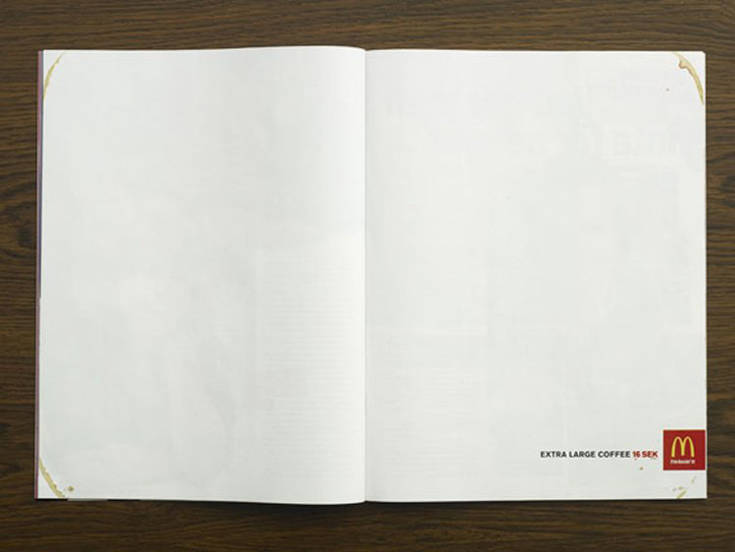 Ήταν το 2008 όταν τα McDonald’s λάνσαραν έναν extra-large καφέ τόσο μεγάλο που δεν χωρούσε καν σε δισέλιδη καταχώριση! Αφήνοντας απλώς στις άκρες των σελίδων τον χαρακτηριστικό κυκλικό λεκέ: «Extra large coffee», έγραφε χαρακτηριστικά…