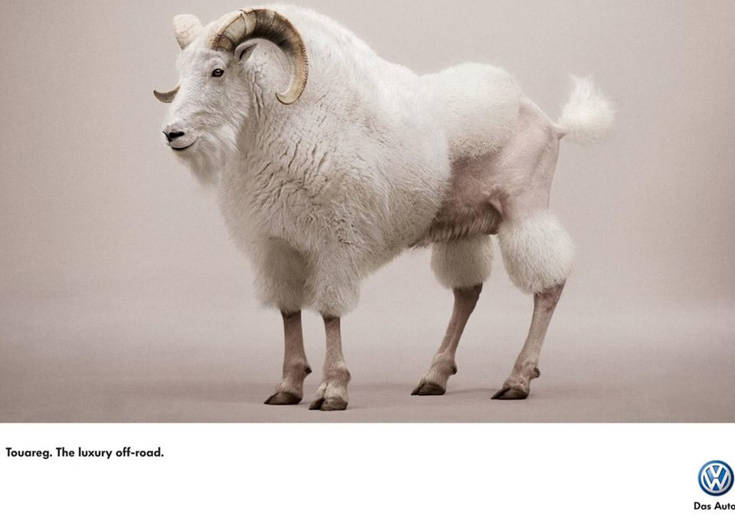 Άλλη μια εταιρία γνωστή για τη μοναδική γραφή της στον χώρο της διαφήμισης, η Volkswagen, κούρεψε εδώ ένα αγριοκάτσικο (ένα εκτός δρόμου ζώο) σαν σκυλάκι σαλονιού (ζώο πόλης), για να δείξει πως το τζιπ της συνδυάζει τα καλύτερα και των δύο κόσμων: «Touareg. Το πολυτελές off-road» (2009)…