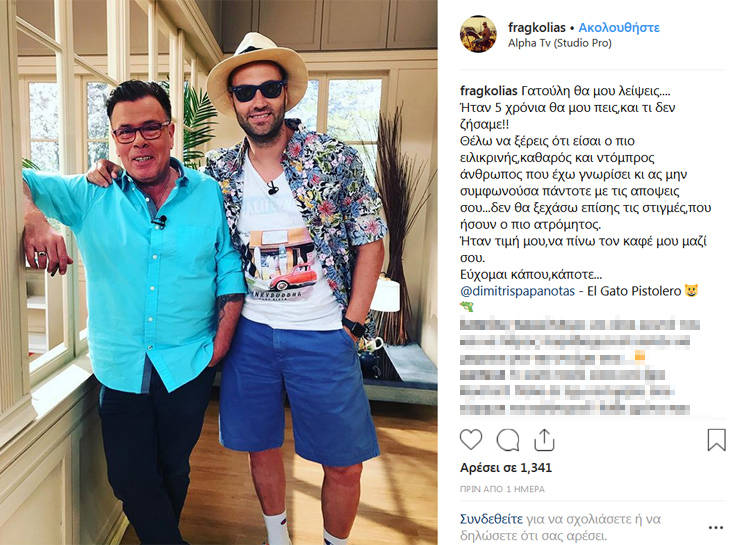 Τον Δημήτρη Παπανώτα θέλησε να αποχαιρετίσει ο Κώστας Φραγκολιάς, με τον οποίο αυτά τα πέντε χρόνια έκαναν καλή παρέα. Ο συνεργάτης της εκπομπής ανέβασε στο λογαριασμό του στο Instagram μία φωτογραφία τους την οποία συνόδευσε με το εξής σχόλιο: