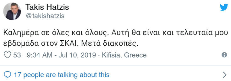 «Καλημέρα σε όλες και όλους. Αυτή θα είναι και η τελευταία μου εβδομάδα στον ΣΚΑΪ. Μετά διακοπές», έγραψε χαρακτηριστικά.