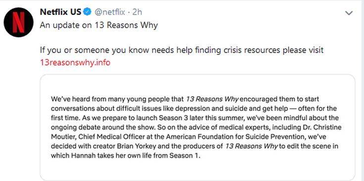 Ο πάροχος επεσήμανε στο Twitter ότι έπειτα από τις συστάσεις ιατρών «αποφασίσαμε μαζί με τον δημιουργό Μπράιαν Γόρκι και τους παραγωγούς του “13 Reasons Why” να κόψουμε τη σκηνή στην οποία εμφανίζεται η Χάνα να αυτοκτονεί».
