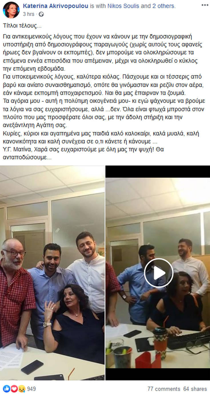 Μέσω μιας ανάρτησης στον προσωπικό της λογαριασμό στο facebook, η Κατερίνα Ακριβοπούλου ανακοίνωσε το πρόωρο τέλος της εκπομπής της, αναφέρθηκε στους αντικειμενικούς αλλά και υποκειμενικούς λόγους που οδήγησαν σε αυτή την απόφαση.