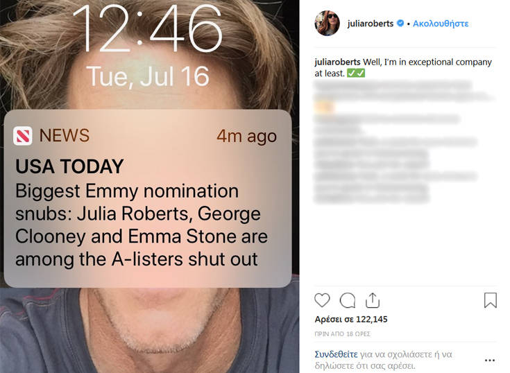 «Λοιπόν, τουλάχιστον συνεργάζομαι με μία εξαιρετική εταιρεία», έγραψε η Ρόμπερτς στον λογαριασμό που διατηρεί στο Instagram μαζί με ένα στιγμιότυπο από την οθόνη του κινητούς της όπου φαίνεται ένα μήνυμα με τα ονόματα ηθοποιών πρώτης γραμμής που έμειναν εκτός βραβείων, όπως ο Τζορτζ Κλούνεϊ που πρωταγωνιστεί στο Catch 22 και την Έμα Στόουν πρωταγωνίστρια του Maniac.