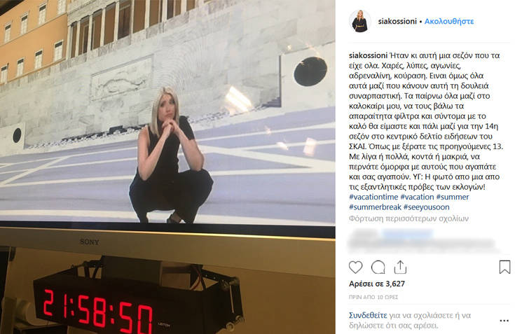 «Ήταν κι αυτή μια σεζόν που τα είχε όλα. Χαρές, λύπες, αγωνίες, αδρεναλίνη, κούραση. Είναι όμως όλα αυτά μαζί που κάνουν αυτή τη δουλειά συναρπαστική. Τα παίρνω όλα μαζί στο καλοκαίρι μου, να τους βάλω τα απαραίτητα φίλτρα και σύντομα με το καλό θα είμαστε και πάλι μαζί για την 14η σεζόν στο κεντρικό δελτίο ειδήσεων του ΣΚΑΪ. Όπως με ξέρατε τις προηγούμενες 13. Με λίγα ή πολλά, κοντά ή μακριά, να περνάτε όμορφα με αυτούς που αγαπάτε και σας αγαπούν. ΥΓ: Η φωτό από μία από τις εξαντλητικές πρόβες των εκλογών! #vacationtime #vacation #summer #summerbreak #seeyousoon».