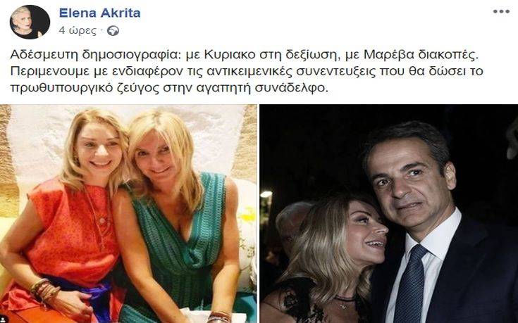 Η Έλλη Στάη απάντησε με μια φωτογραφία της με τη σύζυγο του πρωθυπουργού Μαρέβα Μητσοτάκη. «Προτιμώ Μαρέβα» είχε γράψει στη λεζάντα και η Έλενα Ακρίτα δεν το άφησε να πέσει κάτω…