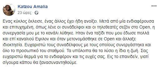 Το τέλος της συνεργασίας της με το OPEN γνωστοποίησε η ίδια η δημοσιογράφος Αμαλία Κάτζου με ανάρτησή της στο Facebook.