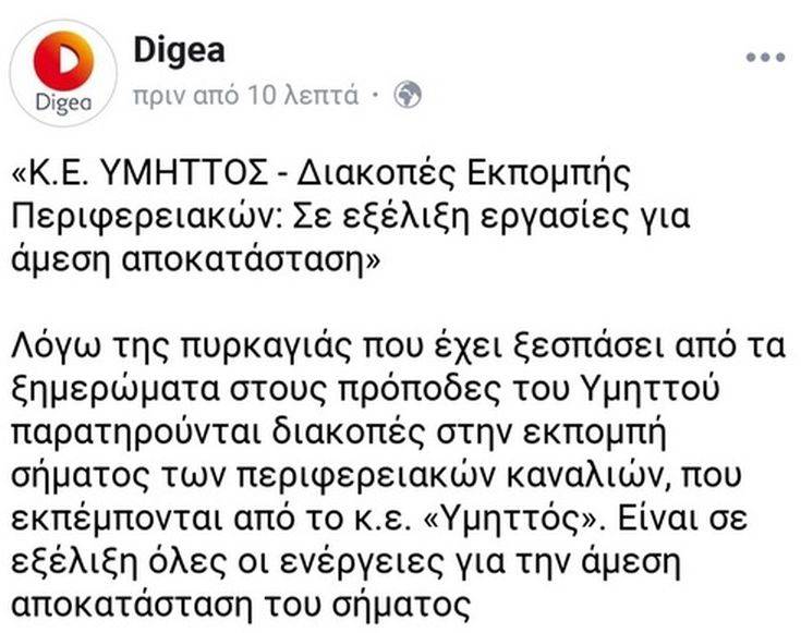 Προβλήματα αντιμετώπισαν και περιφερειακά κανάλια της Αττικής, των οποίων το σήμα διακοπτόταν ανά διαστήματα. Άμεσα ξεκίνησαν εργασίες αποκατάστασης από την Digea, όπως αναφέρει η εταιρεία σε ανακοίνωσή της στα social media.