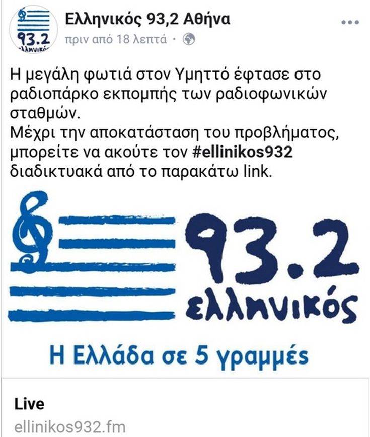 -Nostos 100.6: «Η μεγάλη φωτιά στον Υμηττό προκάλεσε μεγάλα προβλήματα στο ραδιοπάρκο εκπομπής των ραδιοφωνικών σταθμών. Μέχρι την αποκατάσταση των προβλημάτων μπορείτε να μας ακούτε στοwww.nostosradio.gr».
