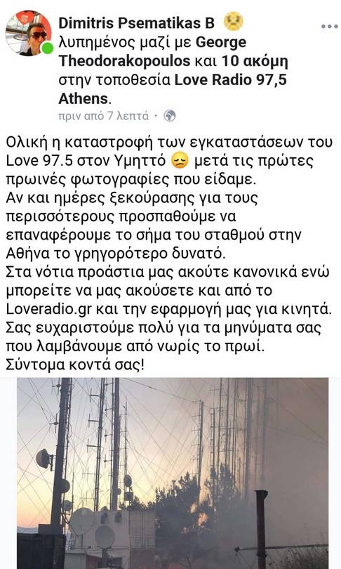 Οι εγκαταστάσεις του Love 97.5 στον Υμηττό καταστράφηκαν, όπως αναφέρει σε post του στα social media ο διευθυντής του σταθμού Δημήτρης Ψεματίκας. Πλέον ο σταθμός ακούγεται μόνο από τον πομπό του στην Αίγινα και στο loveradio.gr.