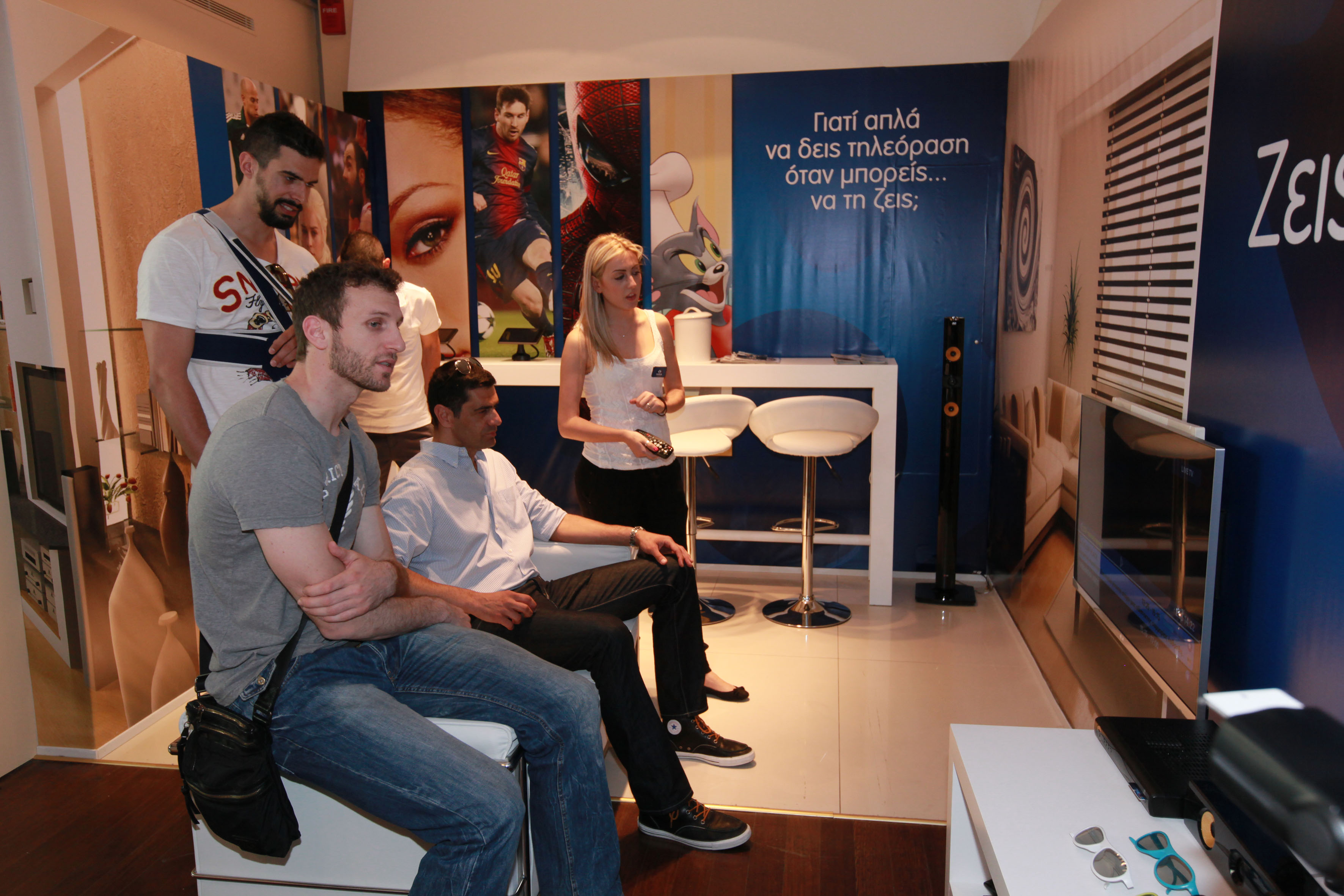 Οι δημοσιογράφοι των καναλιών Novasports, Γιάννης Καράλης και Γιώργος Λυκουρόπουλος, ενώ απολαμβάνουν τη 3D εμπειρία της Nova.