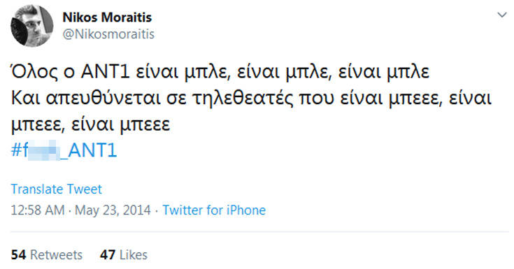 Μάλιστα, πριν λίγα χρόνια έγραφε μεταξύ άλλων, στο λογαριασμό του στο Twitter πως μπορείς να γελοιοποιήσεις έναν άνθρωπο, βάζοντάς τον στην επιτροπή ενός τέτοιου show. Για το κανάλι, πάλι έγραφε τότε χαρακτηριστικά: «Όλος ο ΑΝΤ1 είναι μπλε, είναι μπλε, είναι μπλε Και απευθύνεται σε τηλεθεατές που είναι μπεεε, είναι μπεεε, είναι μπεεε».