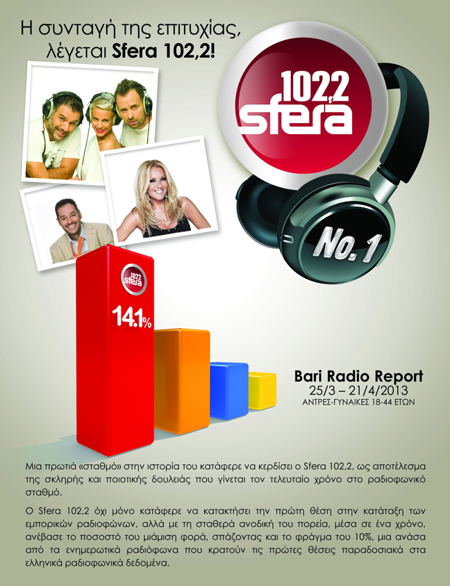 Ο Sfera 102,2 όχι μόνο κατάφερε να κατακτήσει την πρώτη θέση στην κατάταξη των εμπορικών ραδιοφώνων, αλλά με τη σταθερά ανοδική του πορεία, μέσα σε ένα χρόνο, ανέβασε το ποσοστό του μιάμιση φορά, σπάζοντας και το φράγμα του 10%, μία ανάσα από τα ενημερωτικά ραδιόφωνα που κρατούν τις πρώτες θέσεις παραδοσιακά στα ελληνικά ραδιοφωνικά δεδομένα.