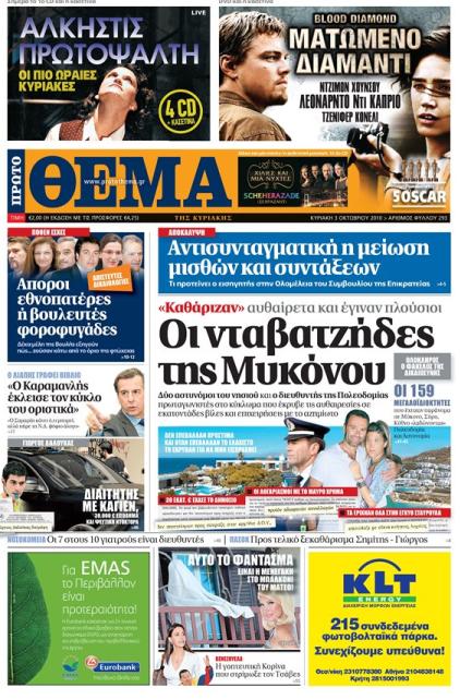 Μην χάσετε αύριο το «Πρώτο θέμα» το οποίο περιλαμβάνει το dvd της ταινίας «Ματωμένο διαμάντι» με τους Λεονάρντο Ντι Κάπριο, Ντζίμον Χούνσου, Τζένιφερ Κονέλι, το 1ο cd «Οι πιο ωραίες Κυριακές» της Άλκηστις Πρωτοψάλτη και το 3ο cd με την αυθεντική μουσική από τη σειρά «Χίλιες και μία νύχτες».