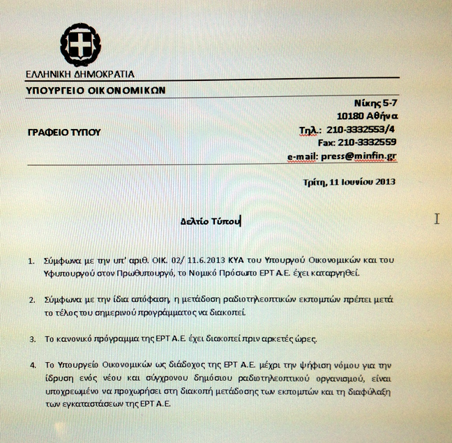 Το υπουργείο Οικονομικών διευκρινίζει ότι «ως διάδοχος της ΕΡΤ Α.Ε. μέχρι την ψήφιση νόμου για την ίδρυση ενός νέου και σύγχρονου δημόσιου ραδιοτηλεοπτικού οργανισμού, είναι υποχρεωμένο να προχωρήσει στη διακοπή μετάδοσης των εκπομπών και τη διαφύλαξη των εγκαταστάσεων της ΕΡΤ ΑΕ».