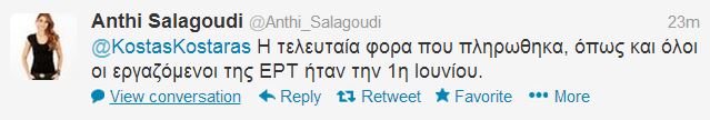 Από την πλευρά της, η Ανθή Σαλαγκούδη, απάντησε έσω twitter σε αυτή την καταγγελία, τονίζοντας ότι πληρώθηκε όπως όλοι οι εργαζόμενοι, την 1η Ιουνίου.