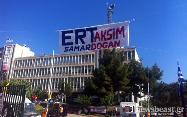 Σε μια ώρα θα ξεκινήσει και η συγκέντρωση του ΠΑΜΕ στην πλατεία της Αγίας Παρασκευής, ενώ διάφορα καινούρια πανό πήραν τη θέση τους σήμερα στο προαύλιο του Ραδιομεγάρου. Από αυτά ξεχωρίζει και το πανό «ERTaksim Samardogan».