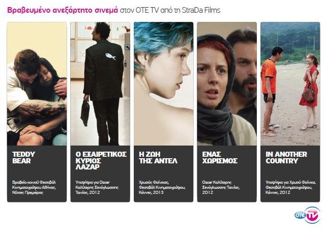 Ο OTE TV έχει εξασφαλίσει για τους συνδρομητές του σπουδαίες ταινίες από την StraDa Films που θα προβληθούν σύντομα στις ελληνικές κινηματογραφικές αίθουσες, όπως η «Ζωή της Αντέλ» (Blue is the Warmest Colour), που κατέκτησε το «Χρυσό Φοίνικα» στο φετινό Φεστιβάλ Κινηματογράφου στις Κάννες, με την ελληνικής καταγωγής ανερχόμενη ηθοποιό Αντέλ Εξαρχόπουλος, η γαλλική κωμωδία «Τα Παλιόπαιδα» (Les Gamins), η δραματική κομεντί «Thanks for Sharing» με τους Μαρκ Ράφαλο, Γκουίνεθ Πάλτροου και Τιμ Ρόμπινς και το «In Αnother Country» με την Ιζαμπέλ Ιπέρ, που έκλεισε το φετινό φεστιβάλ κινηματογράφου στη Θεσσαλονίκη. Οι ταινίες θα προβληθούν σε πρώτη τηλεοπτική προβολή από τα κανάλια OTE Cinema.