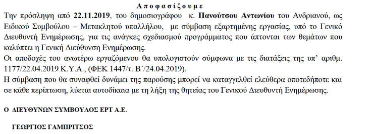 «Την πρόσληψη από 22.11.2019, του δημοσιογράφου κ. Πανούτσου Αντωνίου του Ανδριανού, ως Ειδικού Συμβούλου-Μετακλητού υπαλλήλου, με σύμβαση εξαρτημένης εργασίας, υπό το Γενικό Διευθυντή Ενημέρωσης, για τις ανάγκες σχεδιασμού προγράμματος που άπτονται των θεμάτων που καλύπτει η Γενική Διεύθυνση Ενημέρωσης. Οι αποδοχές του ανωτέρου εργαζόμενου θα υπολογιστούν σύμφωνα με τις διατάξεις της υπ’ αριθμ. 1177/22.04.22019 Κ.Υ.Α., (ΦΕΚ 1447/τ.Β’/24.04.2019).