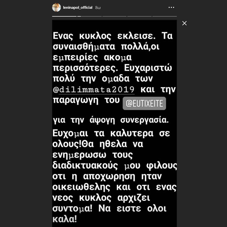 «Ένας κύκλος έκλεισε. Τα συναισθήματα πολλά, οι εμπειρίες ακόμα περισσότερες. Ευχαριστώ πολύ την ομάδα των Διλιμμάτων και την παραγωγή του Ευτυχείτε για την άψογη συνεργασία. Εύχομαι τα καλύτερα σε όλους. Θα ήθελα να ενημερώσω τους διαδικτυακούς μου φίλους ότι η αποχώρηση ήταν οικειοθελής και ότι ένας νέος κύκλος αρχίζει σύντομα! Να είστε όλοι καλά!» έγραψε η Λένια Πολυχρονοπούλου στο μήνυμά της.
