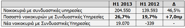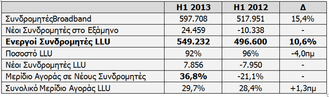 Σημαντική αύξηση παρουσίασε η συνδρομητική βάση συνδυαστικών υπηρεσιών κατά 46,5% σε σχέση με το 1ο εξάμηνο του 2012. Το μερίδιο αγοράς νέων συνδρομητών LLU το 1ο εξάμηνο του 2013 ανήλθε στο 36,8%.