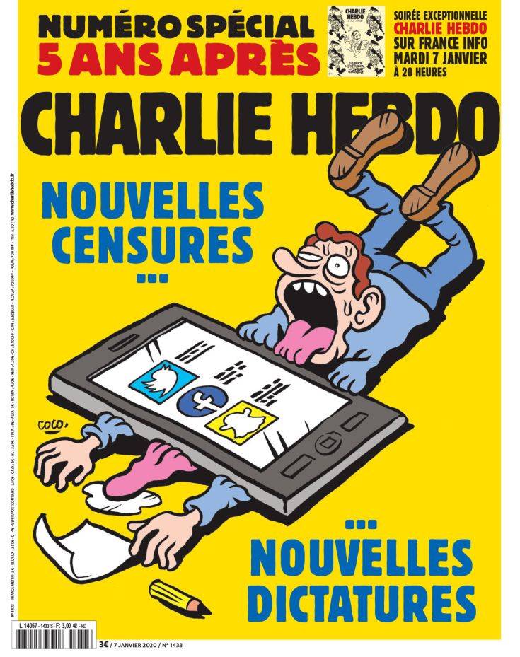 «Νέες λογοκρισίες… Νέες δικτατορίες» καταγγέλλει σήμερα στο εξώφυλλο του επετειακού φύλλου της η Charlie Hebdo. Η εβδομαδιαία εφημερίδα καταφέρεται εναντίον των «νέων γκουρού της σχηματοποιημένης σκέψης» και δίνει τον λόγο σε συγγενείς των θυμάτων, μεταξύ των οποίων η Μαρίζ Βολίνσκι, χήρα του σκιτσογράφου.