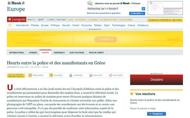Στο ίδιο μήκος κύματος και η διαδικτυακή έκδοση της γαλλικής Monde όπου επισημαίνεται η χρήση δακρυγόνων από την αστυνομία αλλά και ο διαρκώς μειούμενος αριθμός διαδηλωτών που συμμετέχουν στις πορείες διαμαρτυρίας.
