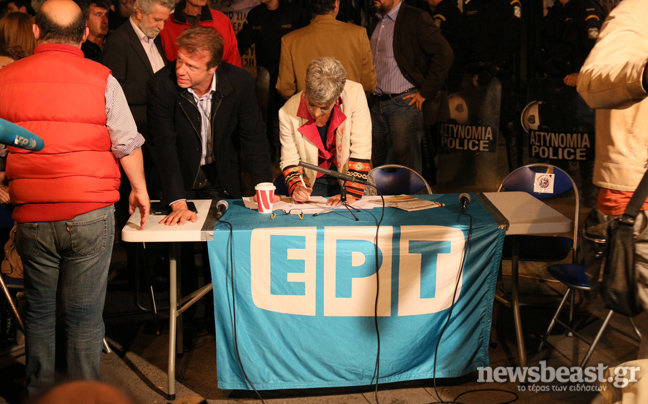 Το τραπέζι παρουσιαστών και καλεσμένων βρίσκεται έξω από την είσοδο του ραδιομεγάρου, όπου έχουν παραχθεί δυνάμεις ασφαλείας. Στο πάνελ βρίσκεται και ο Θόδωρος Δρίτσας, βουλευτής του ΣΥΡΙΖΑ.