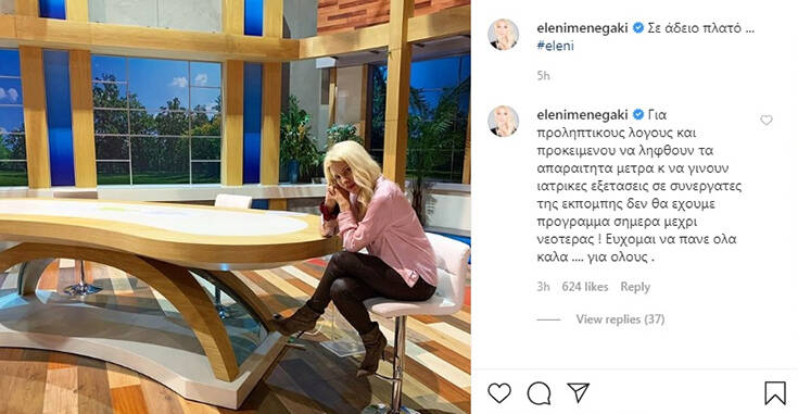 «Για προληπτικούς λόγους και προκειμένου να ληφθούν τα απαραίτητα μέτρα κ να γίνουν ιατρικές εξετάσεις σε συνεργάτες της εκπομπής δεν θα έχουμε πρόγραμμα σήμερα μέχρι νεοτέρας ! Εύχομαι να πάνε όλα καλά …. για όλους » έγραψε η Ελένη Μενεγάκη στην ανάρτηση της.