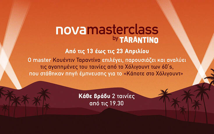 Στο κανάλι «Nova Masterclass by Tarantino» θα προβληθούν οι δέκα ταινίες, δύο καθημερινά από τις 19:30, οι οποίες ενέπνευσαν τον ταλαντούχο σκηνοθέτη να δημιουργήσει το «Κάποτε…στο Χόλυγουντ». Ο Tarantino παραδίδει ο ίδιος μαθήματα σκηνοθεσίας, σχολιάζοντας και αναλύοντας εμβόλιμα τις αγαπημένες του σκηνές στις 10 ταινίες που τον ενέπνευσαν, κατά τη διάρκεια της προβολής τους (“Bob & Carol & Ted & Alice», «Το Αγκάθι», «Ξένοιαστος Καβαλάρης», «Model Shop», «Battle of the Coral Sea», «Getting Straight”, «Τα μυστικά όπλα των κατασκόπων”, «Hammerhead», «Gunman’s Walk», «Arizona Raiders»).