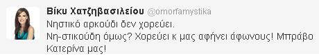 Μέσω του προσωπικού της λογαριασμού στο twitter η Βίκυ Χατζηβασιλείου έγραψε ένα μήνυμα με το οποίο έδινε συγχαρητήρια στην Κατερίνα Στικούδη για το χορό της στο ζωντανό του Dancing With The Stars.