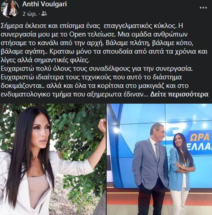 «Σήμερα έκλεισε και επίσημα ένας επαγγελματικός κύκλος. Η συνεργασία μου με το Open τελείωσε. Μια ομάδα ανθρώπων στήσαμε το κανάλι από την αρχή. Βάλαμε πλάτη, βάλαμε κόπο, βάλαμε αγάπη.. Κραταω μόνο τα σπουδαία από αυτά τα χρόνια και λίγες αλλά σημαντικές φιλίες.