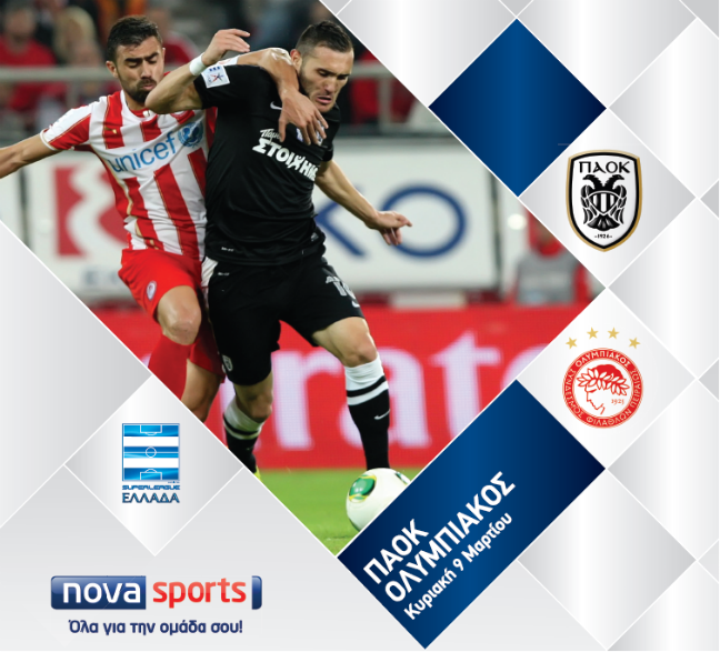 Τα ντέρμπι της Super League συνεχίζονται ασταμάτητα στα κανάλια Novasports! Οι συνδρομητές των αθλητικών καναλιών της Nova την Κυριακή 9 Μαρτίου στις 19:30 θα έχουν την ευκαιρία να παρακολουθήσουν ζωντανά και αποκλειστικά και σε High Definition μέσα από τα Novasports 1 & Novasports 1 HD το ντέρμπι ΠΑΟΚ – Ολυμπιακός στο πλαίσιο της 28ης αγωνιστικής της Super League που θα διεξαχθεί στο γήπεδο της Τούμπας.