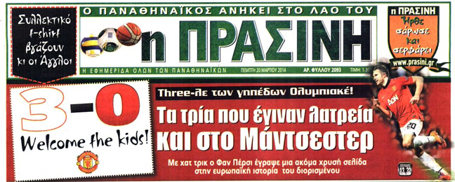 Με τον τίτλο «Three-λε των γηπέδων Ολυμπιακέ» η «ΠΡΑΣΙΝΗ» αναφέρεται στην ήττα των Πειραιωτών στο Ολντ Τράφορντ και συνεχίζει: «Τα τρία που έγιναν λατρεία και στο Μάντσεστερ»…